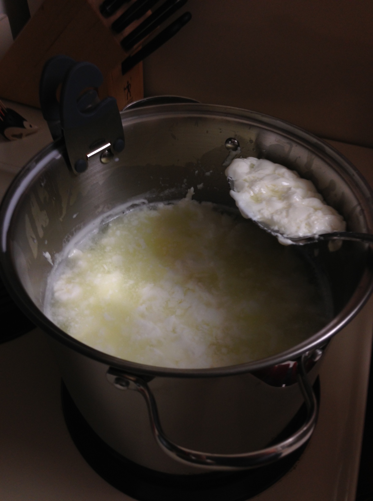 I had forgotten about the stainless steel pot! I told Ryan we couldn’t make the cheese yet because we needed a specific pot – because apparently aluminum and cast iron (the only pots we have!) can be reactive with the cheese.